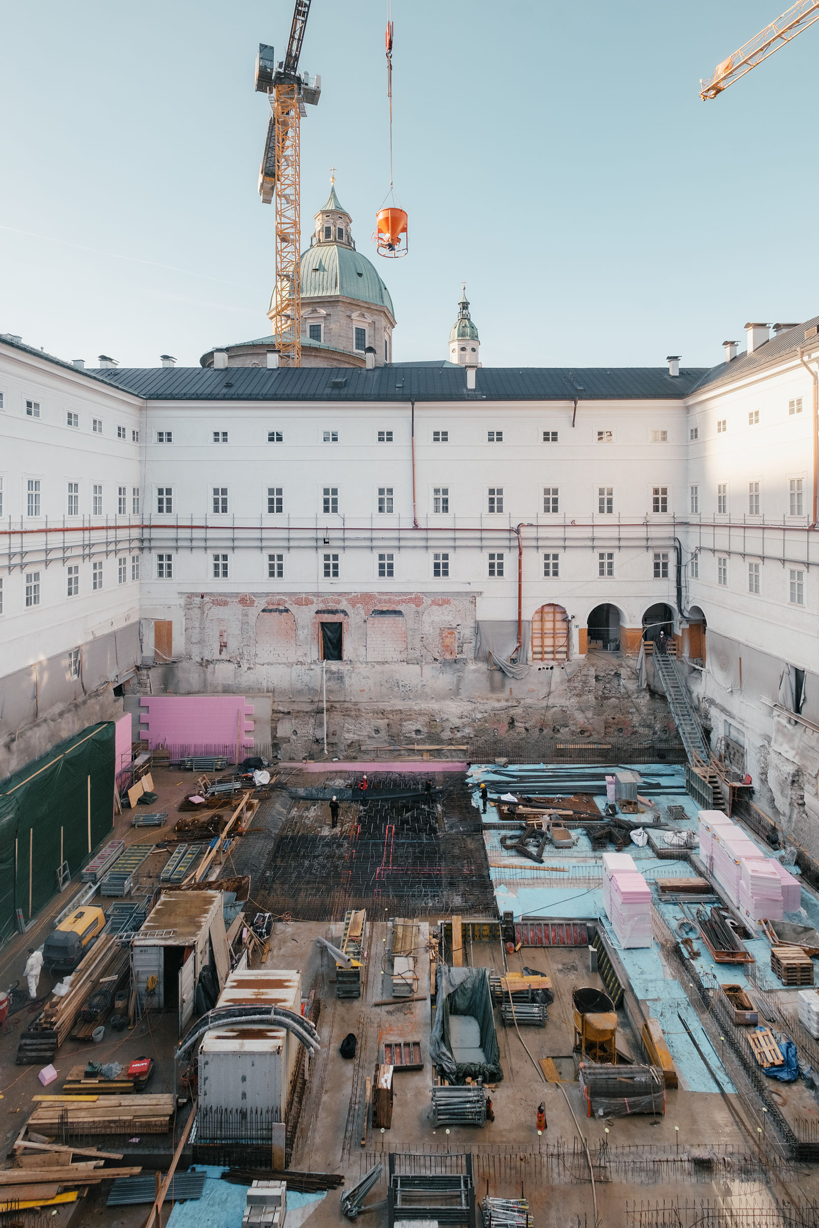 Baugrube und Rohbauzustand im Innenhof der historischen Neuen Residenz. Dokumentiert werden der Bestandsumbau und die Museumserweiterung. Der zukünftige Lichtbrunnen bildet das zentrale Motiv des Projekts, die neue Treppenanlage verbindet die Ausstellungsraeume mit dem historischen Bestand.